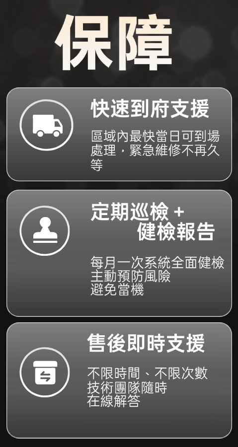 專屬技術團隊定期上門巡檢,確保系統穩定、安全、高效