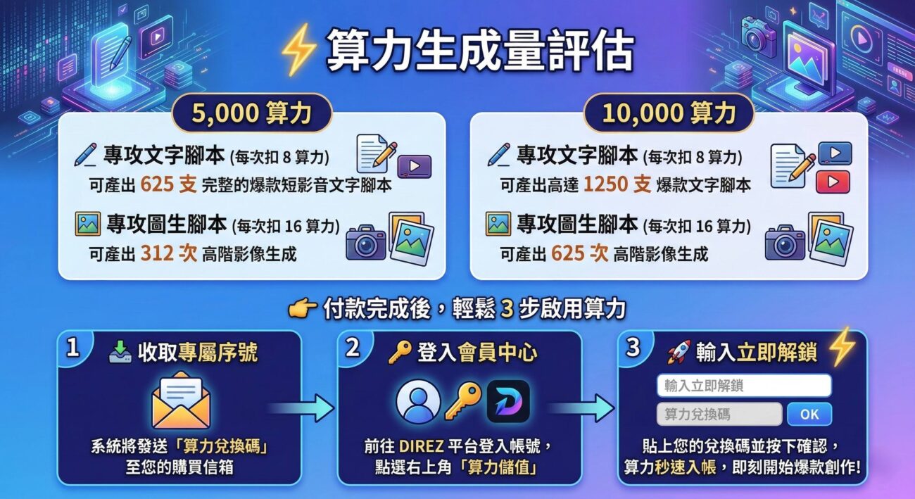 【DIREZ 全能工作站】授權算力兌換碼|一站式 AI 影音創作神器|短影音腳本/分鏡/AI繪圖/動態腳本 快速生成
