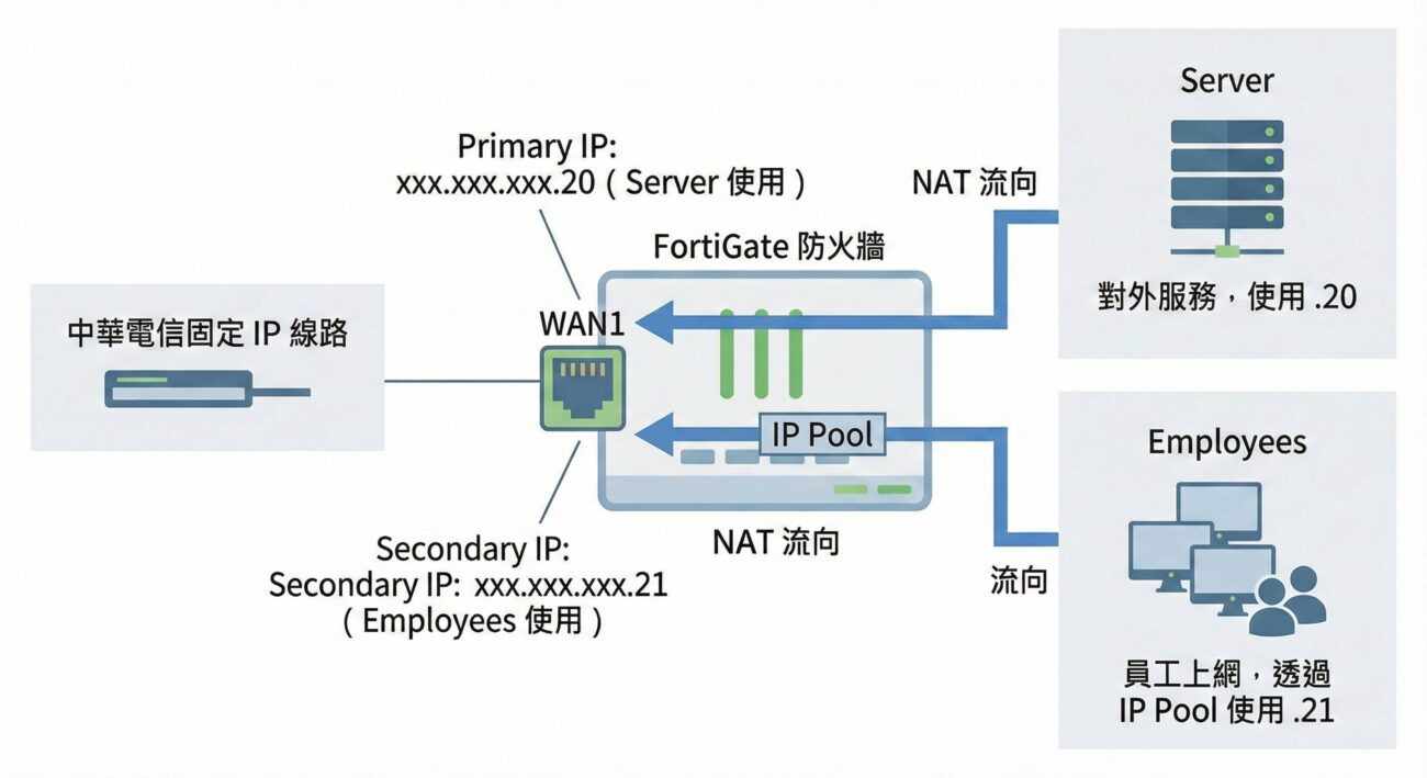 22 12 月 FortiGate 防火牆雙 IP 正確設定方式(同一條固定線路) FortiGate 防火牆雙 IP 正確設定方式(同一條固定線路) 【情境】 中華電信固定 IP 一條線,給 2 個 IP 【常見錯誤】 WAN1 設 .20、WAN2 設 .21 → 會跳錯:IP address is in the sa... Continue reading