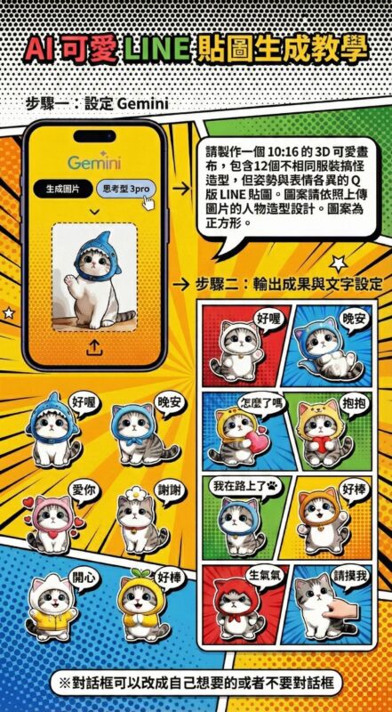 22 12 月 Gemini 生成 LINE 貼圖指令 📌 Gemini 生成 LINE 貼圖指令 請依照我上傳的圖片人物造型,製作一組 Q 版 3D 可愛風格的 LINE 貼圖,並符合以下條件: 畫面與比例 畫布比例:10:16 每個貼圖皆為「正方形」 整體風格:3D、可愛、Q 版 背... Continue reading