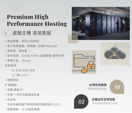台灣在地廠商,支援中心團隊服務 運行時間保證達到 99.9% 我們能保證網站運行時間達到一定水準,讓您不再錯失客戶。 容易操作的控制面板 取得符合業界標準的 cPanel,可用來安裝應用程式、管理備份及安全性 無限頻寬 能夠處理貴企業產生的所有流量。 每日自動備份 整個主機服務帳戶都能復原到前一天的狀況 全球資料中心 選用位於北美和歐洲的資料中心,享受更快的頁面載入時間 全天候網路安全性和 DDoS 防護功能 為您的所有網站加上免費 SSL 憑證 取得既快速又可靠的主機服務,並隨附免費 SSL3 從個人網站,到追求高效能的網站,都要選擇值得信賴的主機服務(單件或大量採購詢價皆可向我們洽詢)