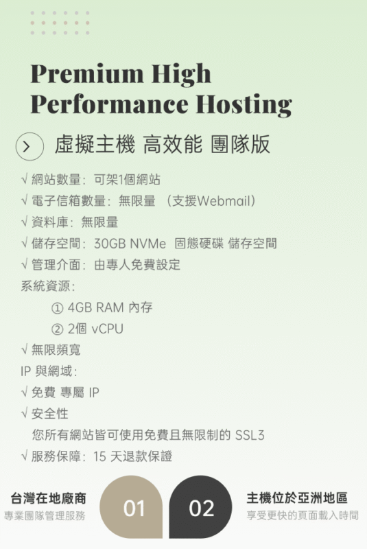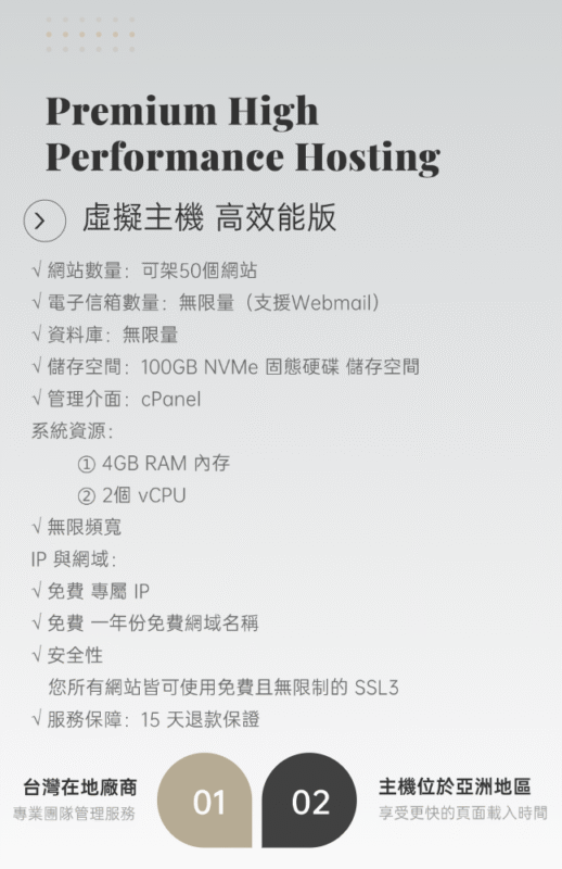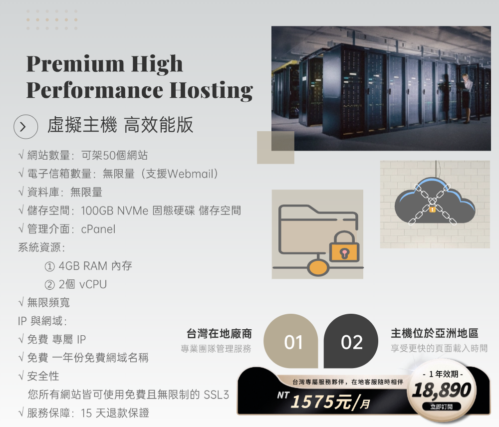 台灣在地廠商,支援中心團隊服務 運行時間保證達到 99.9% 我們能保證網站運行時間達到一定水準,讓您不再錯失客戶。 容易操作的控制面板 取得符合業界標準的 cPanel,可用來安裝應用程式、管理備份及安全性 無限頻寬 能夠處理貴企業產生的所有流量。 每日自動備份 整個主機服務帳戶都能復原到前一天的狀況 全球資料中心 選用位於北美和歐洲的資料中心,享受更快的頁面載入時間 全天候網路安全性和 DDoS 防護功能 為您的所有網站加上免費 SSL 憑證 取得既快速又可靠的主機服務,並隨附免費 SSL3 從個人網站,到追求高效能的網站,都要選擇值得信賴的主機服務 我們的虛擬主機專家很樂意協助您, 歡迎撥打專線 +886 (02) 2986-2833