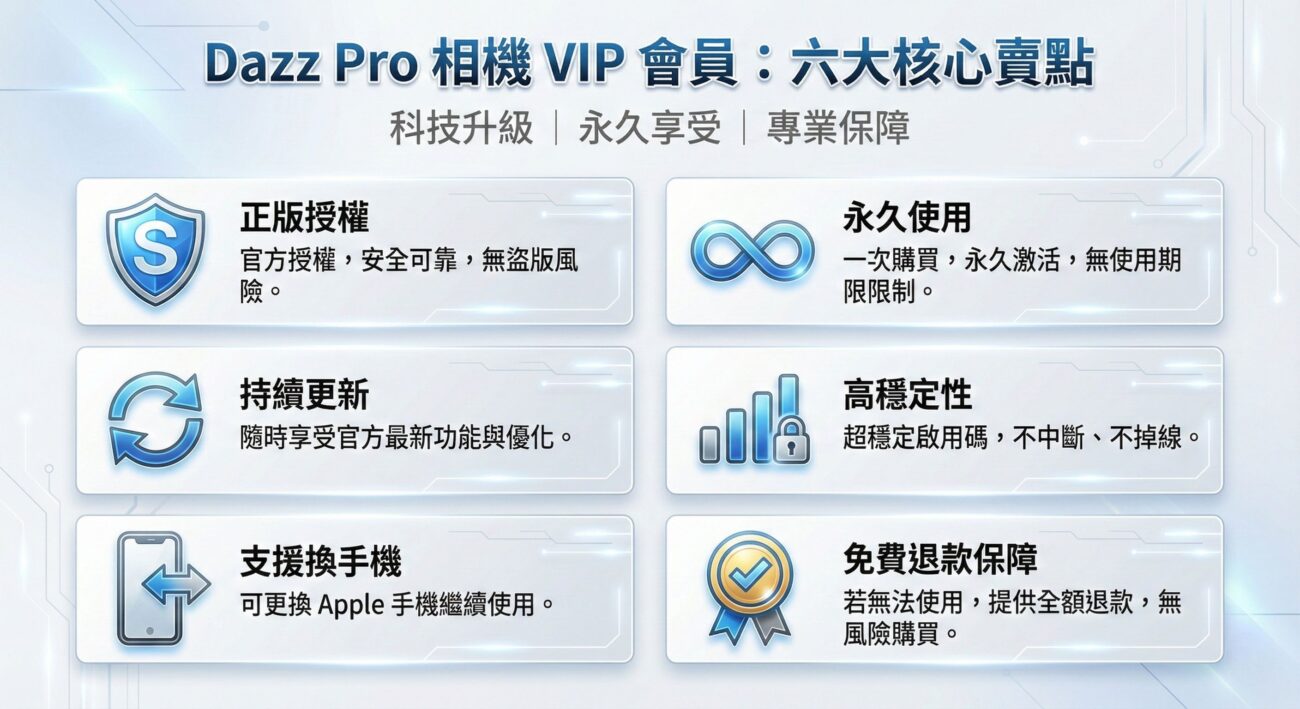 Dazz Pro 相機 VIP 會員|超穩定|高品質啟用不中斷|支援換手機與App Store官方更新|富士調色